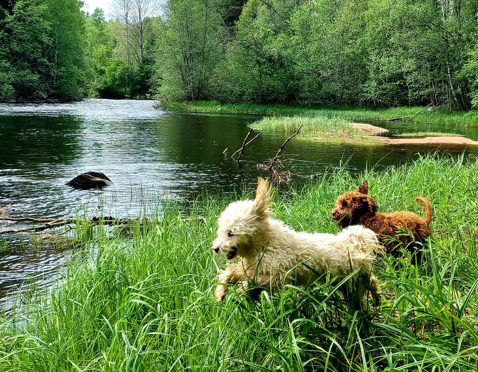 Våra hundar får växa upp i hemmiljö, springa ute i det fria och bekanta sig med gårdens andra djur. Hundarna älskar att bada på ån på sommaren. De har springtävlingar på väg till ladugården och vid skogspromenader. De njuter av att få hänga med i trädgården och hålla koll på hästarna och lamorna i hagen.